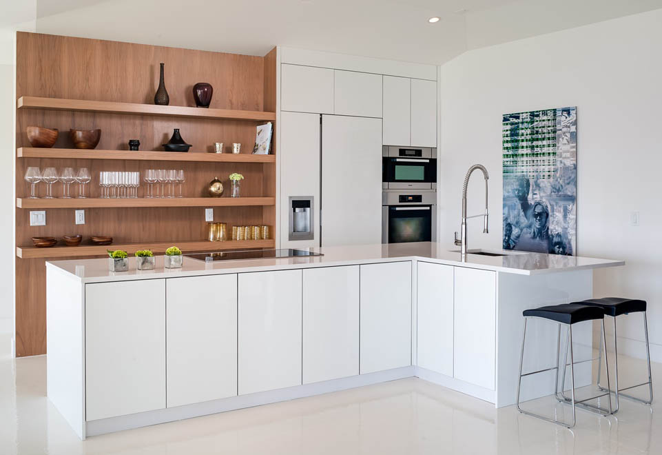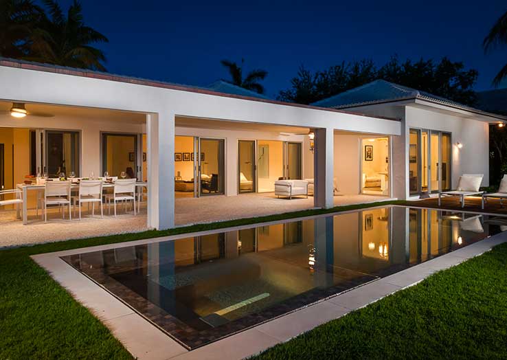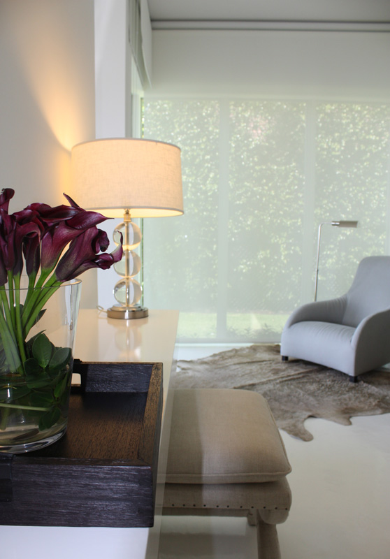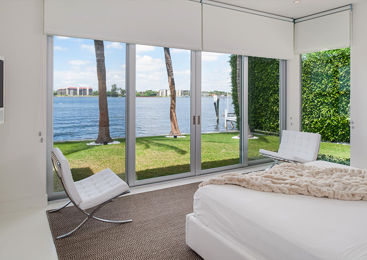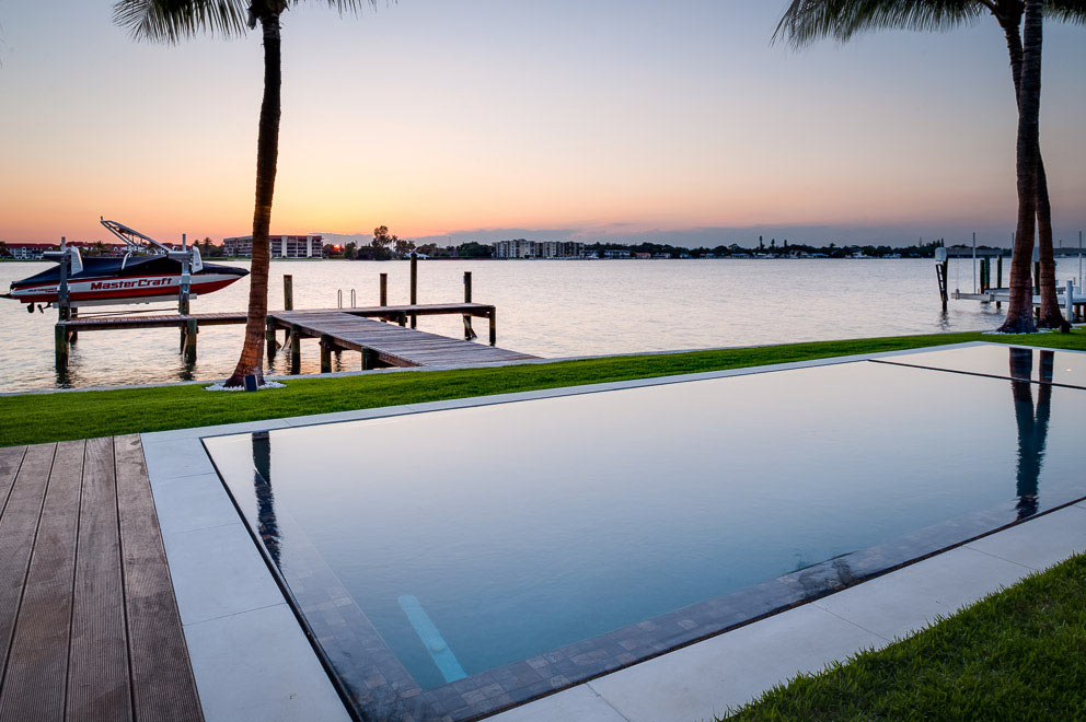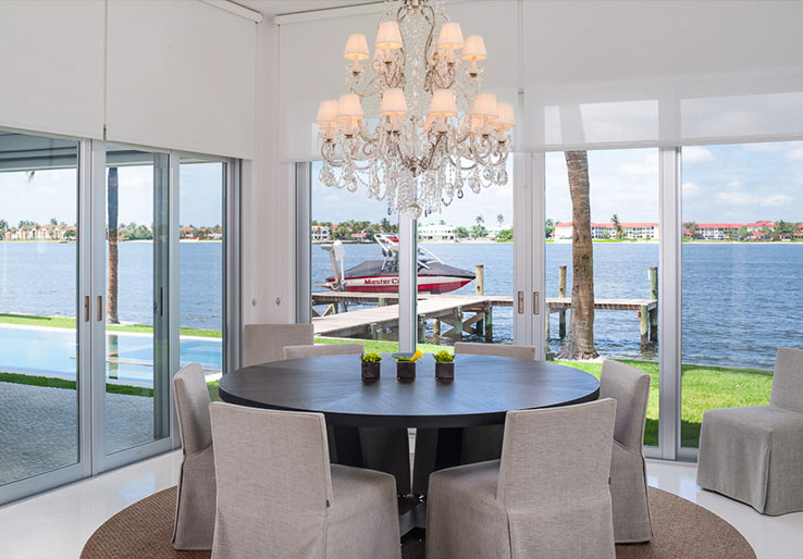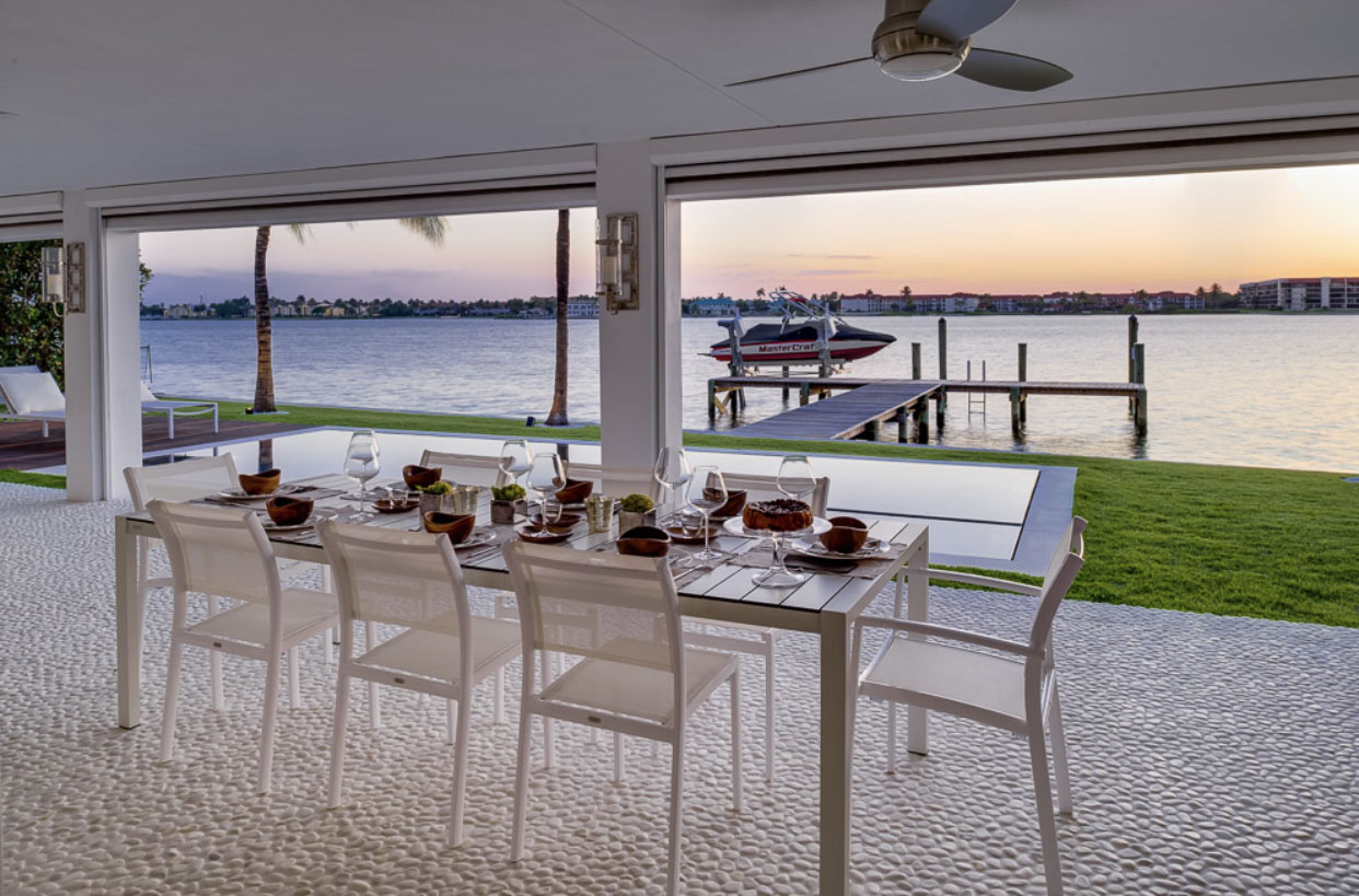 The design focus for this renovated waterfront one-story home was to blend interior spaces with the outdoors, enhancing the beautiful water views to create a seamless, continuous, and modern living space. A neutral color palette of natural fabrics and materials complement the vast blue water views and sunsets and provide an ideal setting to display the client’ s art collection.