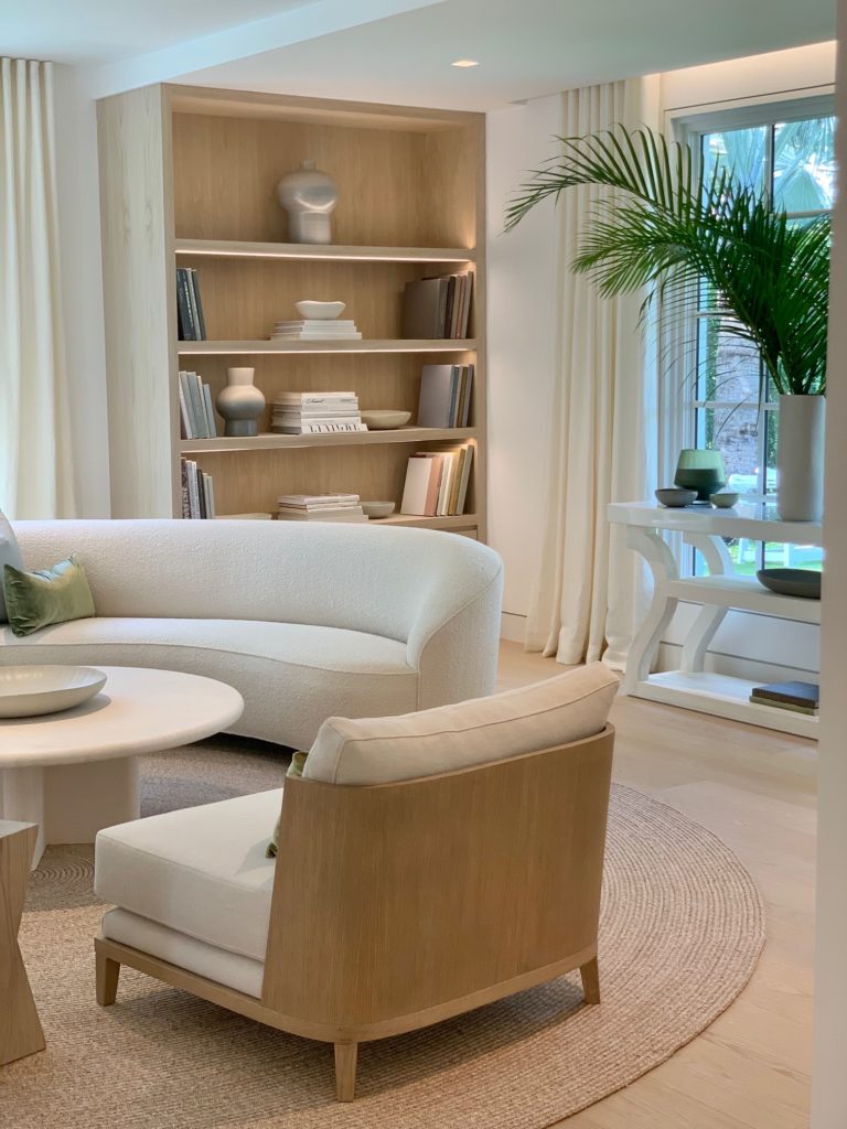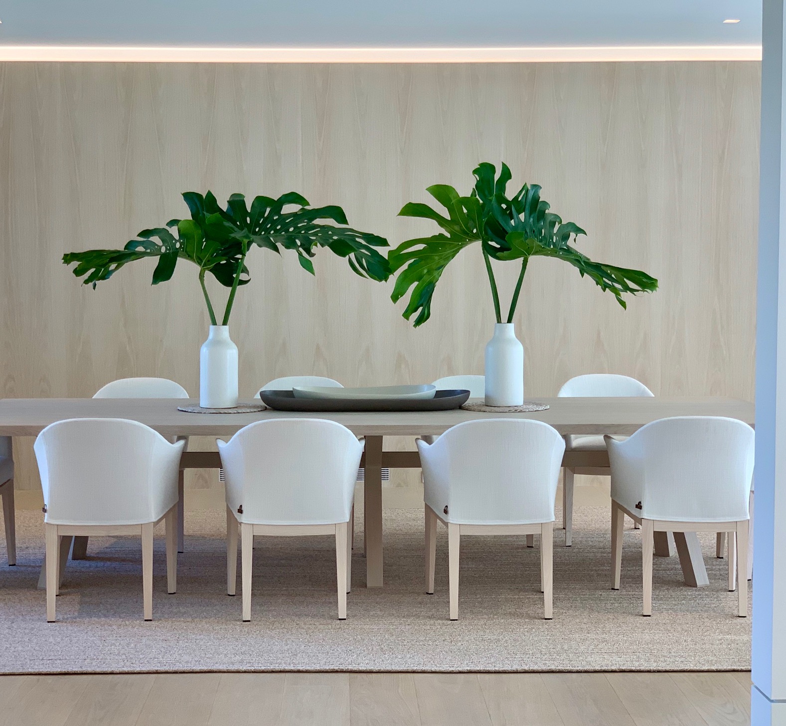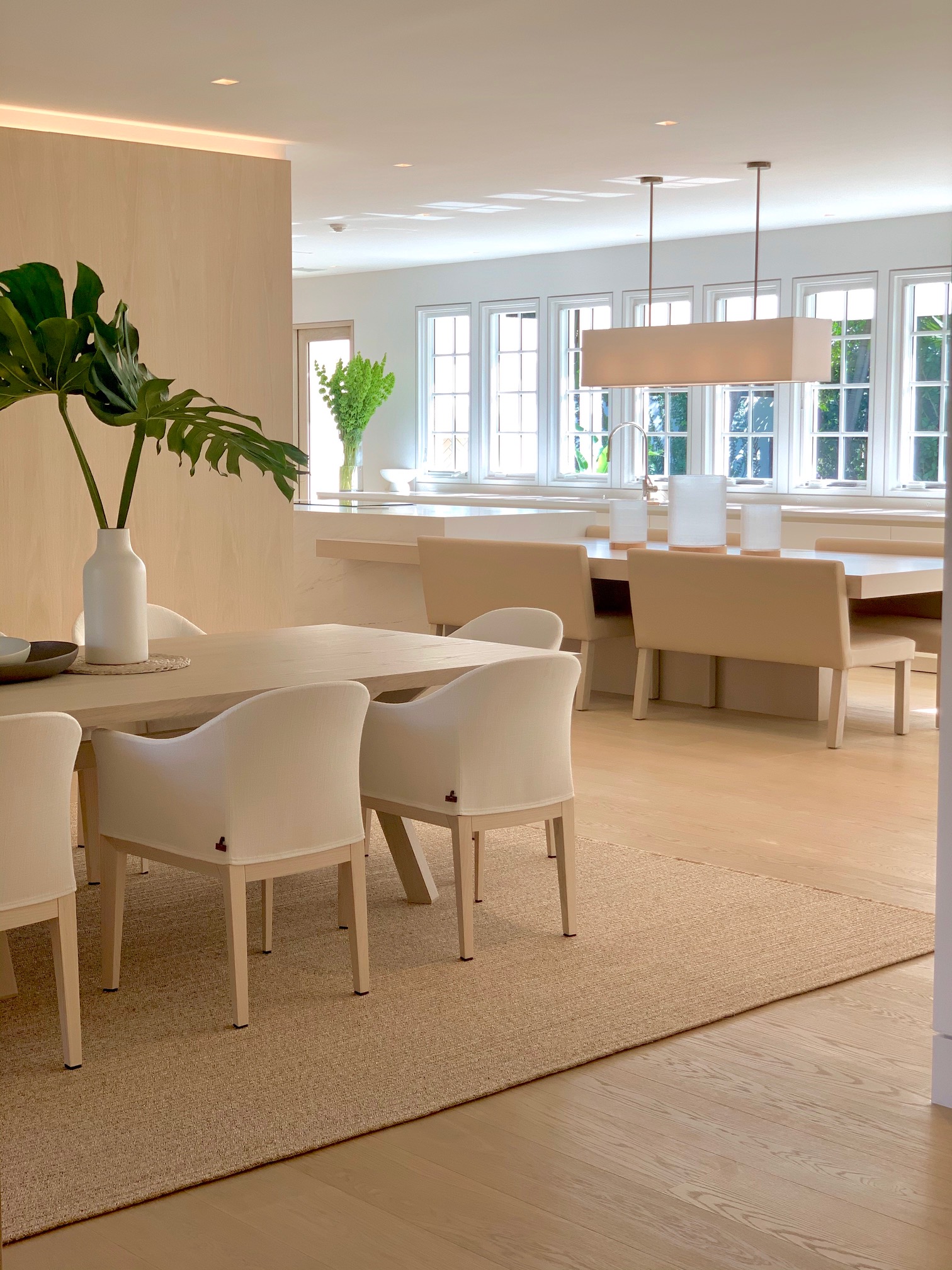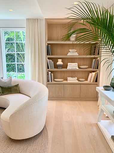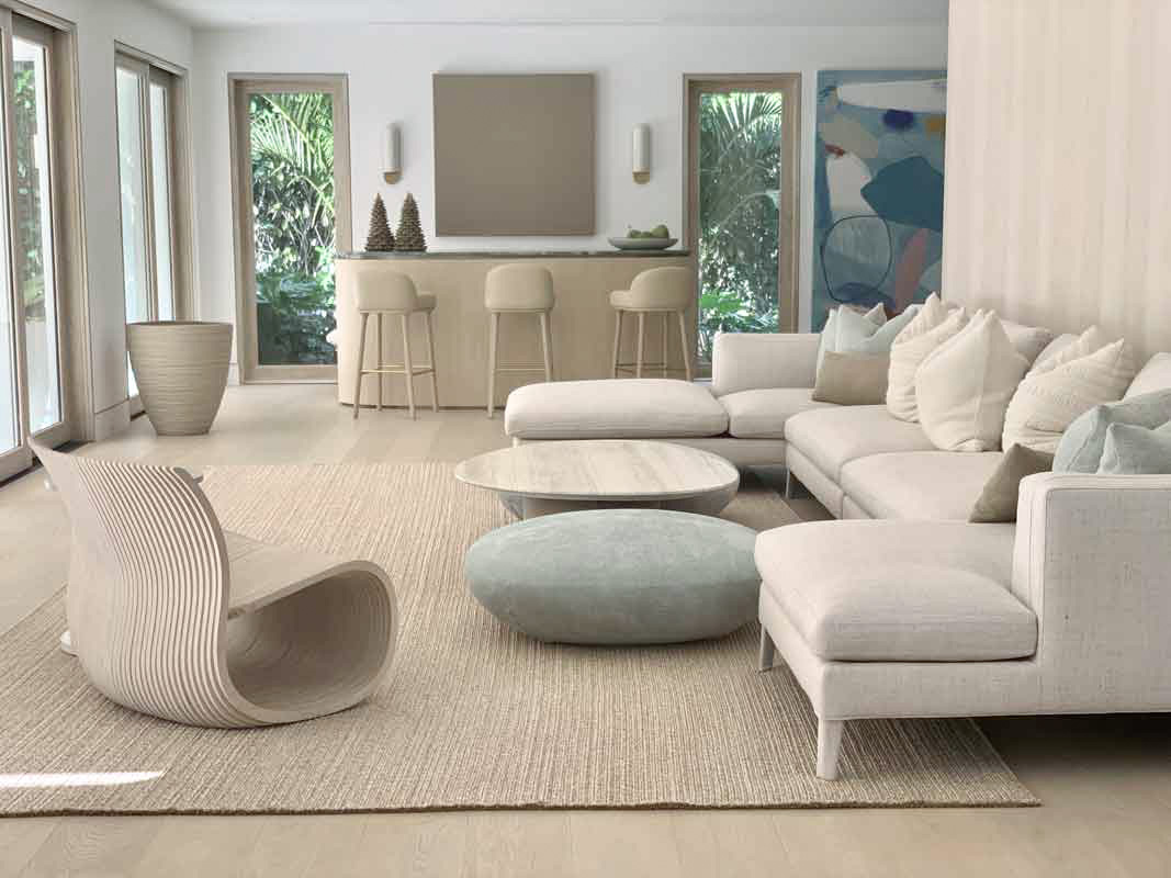 Upon entering the sunlit home, the feeling of island tranquility immerses. Inspired by the organic minimalist European design movement, a calm, textured palette and oak screening are paired with soft, brushed brass metal detailing, Roman Travertine and authentic Italian Plaster used as accent finish for some areas. An expansive kitchen island is the heart of the family compound. This house was meticulously designed to emphasize an open floor plan and merge indoor and outdoor spaces based around a vision of an organic, modern oasis in a tropical setting.