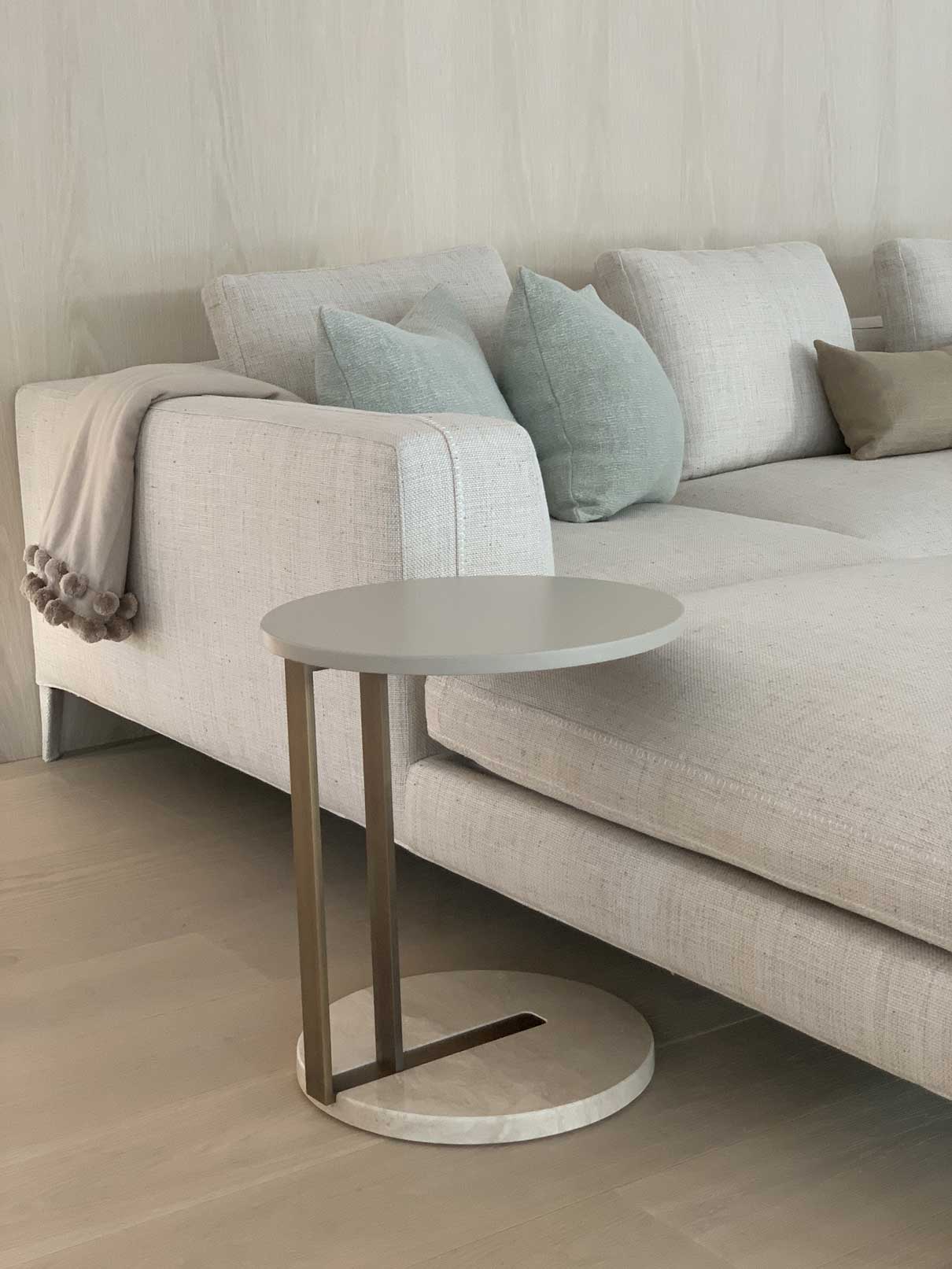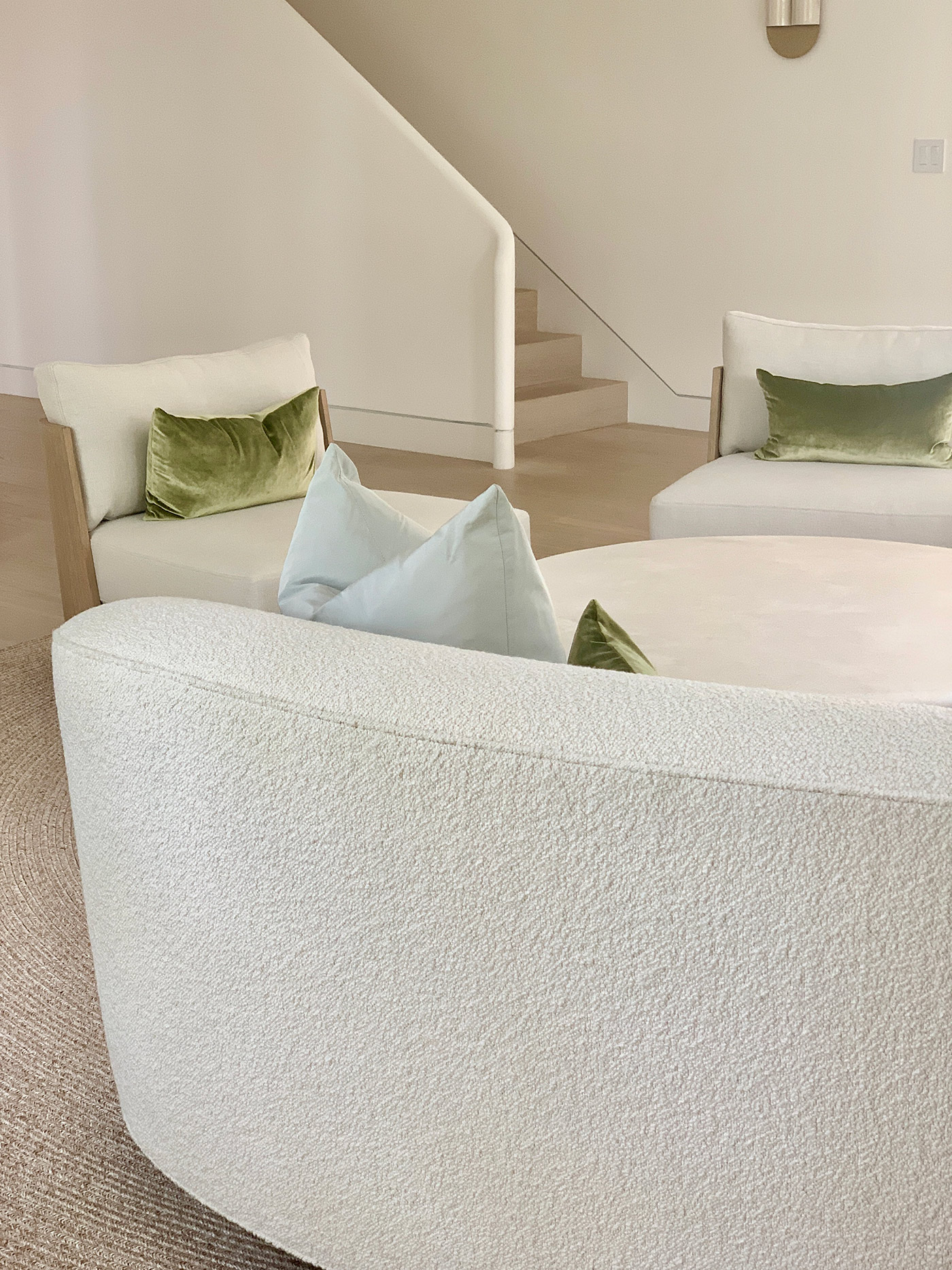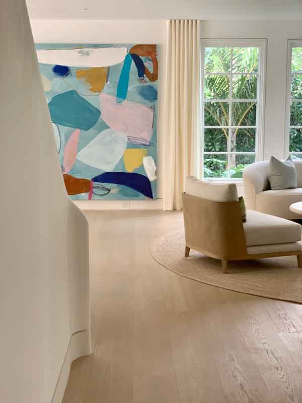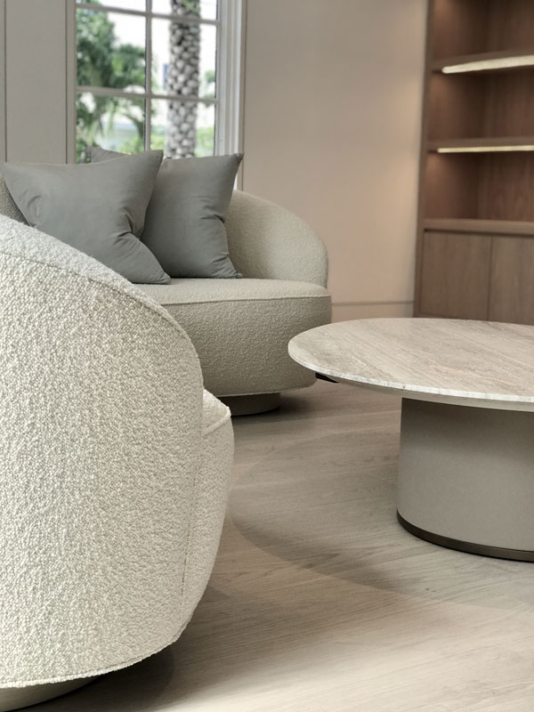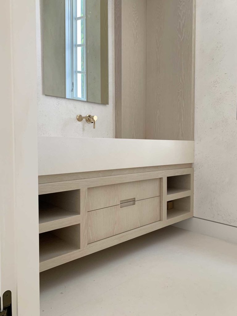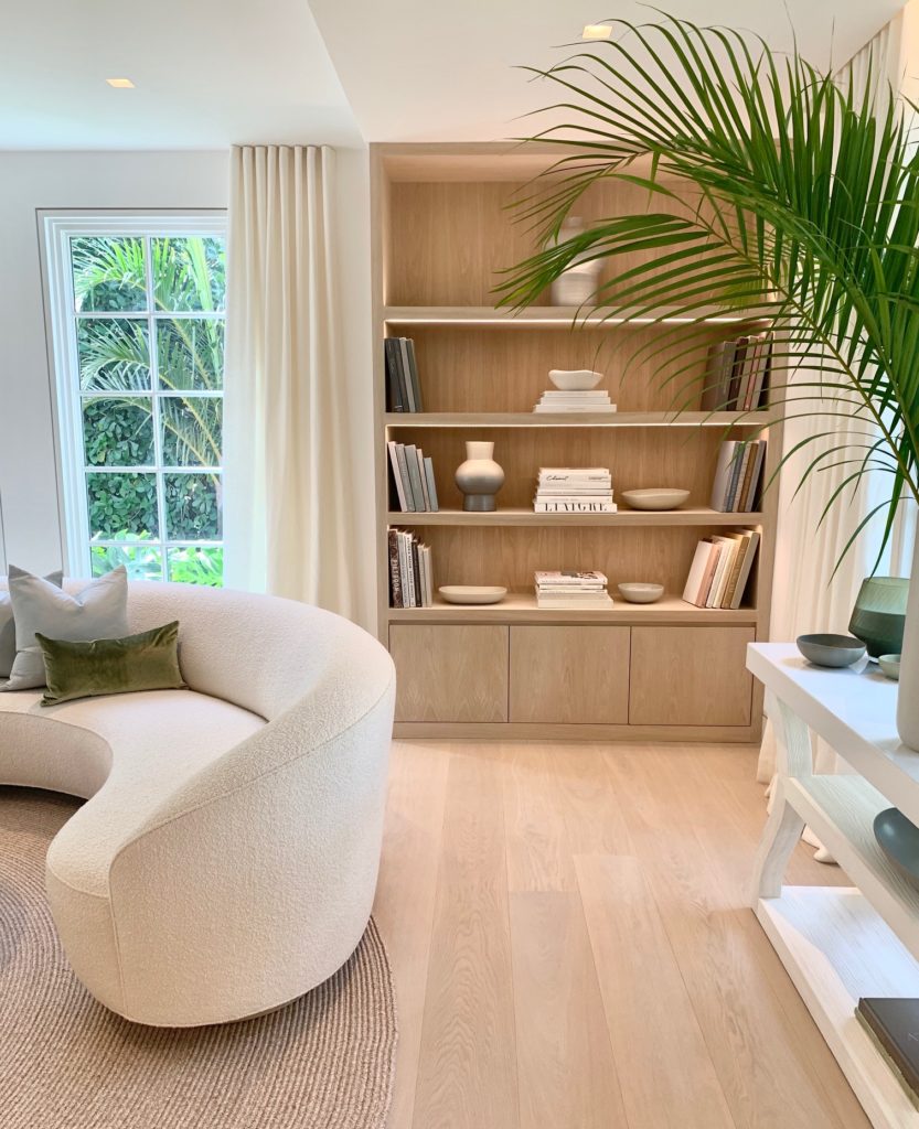 Upon entering the sunlit home, the feeling of island tranquility immerses. Inspired by the organic minimalist European design movement, a calm, textured palette and oak screening are paired with soft, brushed brass metal detailing, Roman Travertine and authentic Italian Plaster used as accent finish for some areas. An expansive kitchen island is the heart of the family compound. This house was meticulously designed to emphasize an open floor plan and merge indoor and outdoor spaces based around a vision of an organic, modern oasis in a tropical setting.