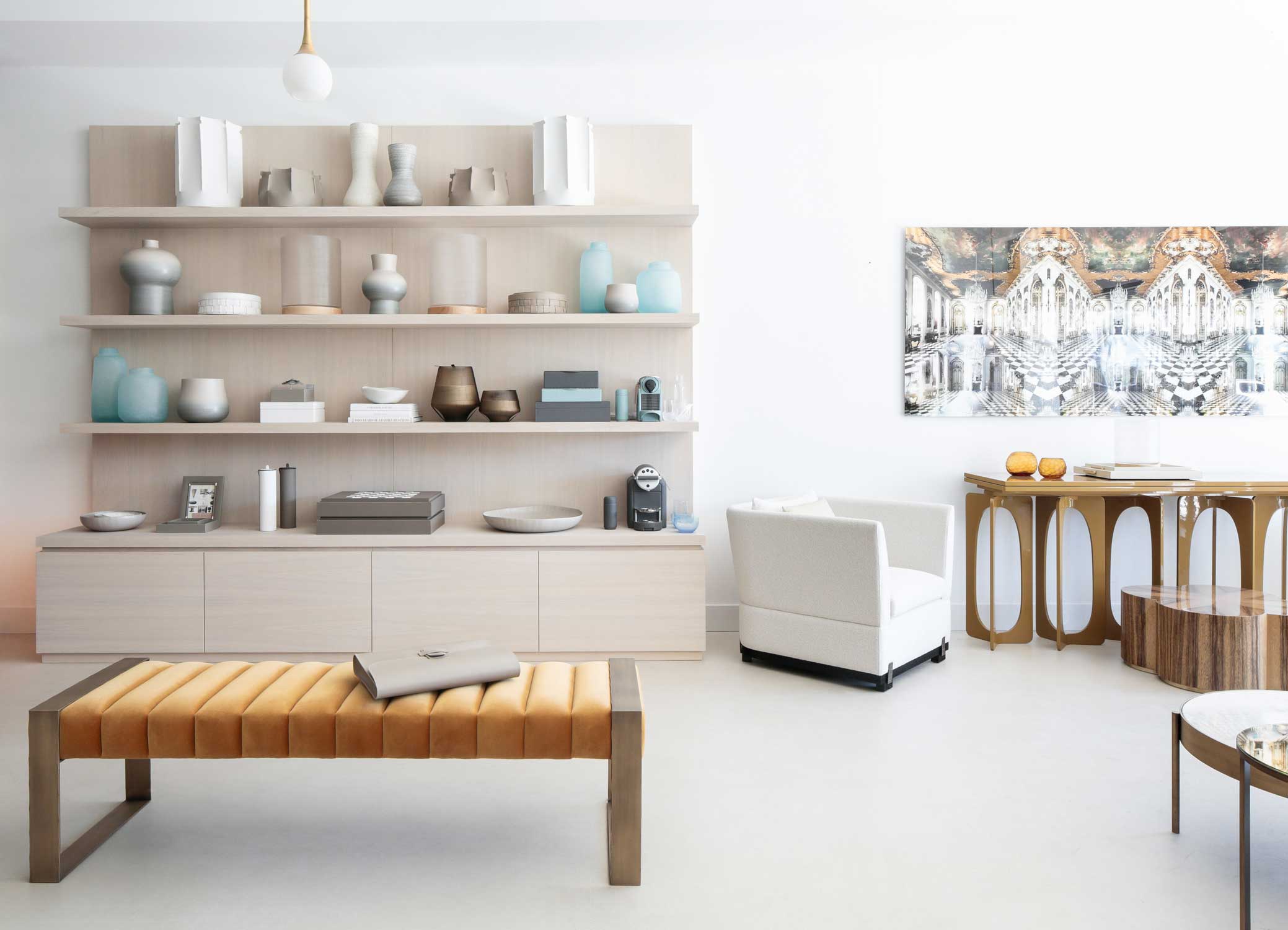 The vibe of the store can be explained as soft and sensual calmness, which creates a perfect atmosphere to stage home décor items and one of the kind furniture. The store is elegant and timeless in its simplicity. This experience is created by an affinity for craftsmanship, detail, and atmosphere introduced through brushed light oak wood found in the shelving units, an authentic Italian Limestone Plaster used as accent finish on same walls, and a soft warm and natural color palette found in furniture, surfaces, fabrics, and accessories. This composition of understated luxury exudes a certain serenity and defines the COMO signature look and lifestyle.
